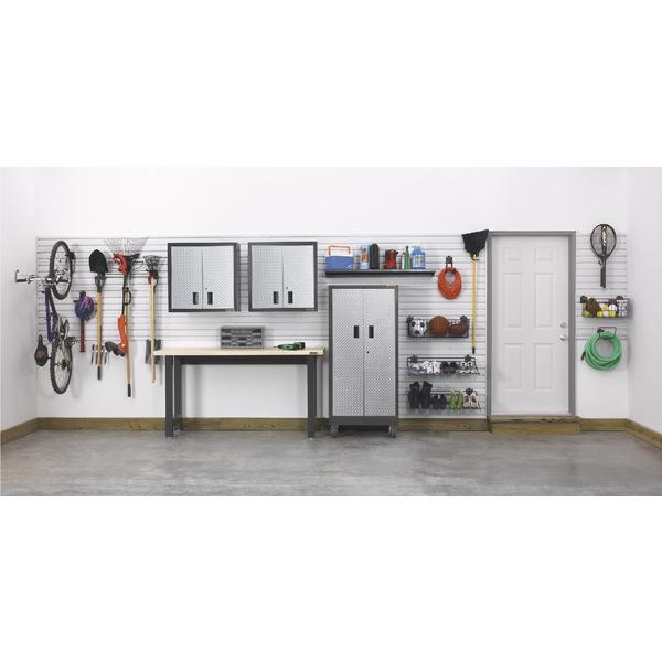Available in one foot high by eight foot long sections these robust panels are compatible with all gladiator garageworks wall products and are designed to hold up to 50 pounds of weight per linear foot enough to support even heavy garage items such as loaded cabinets or bikes.